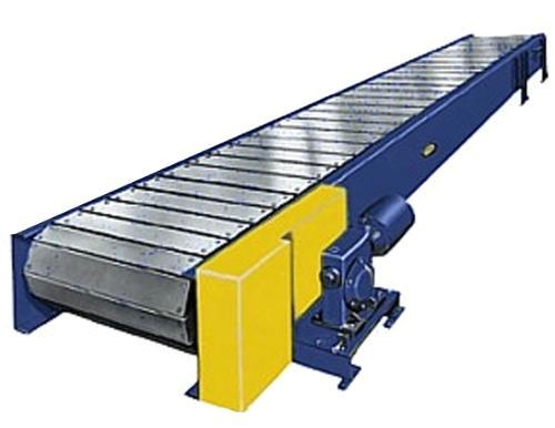 Планчатый конвейер имеет несущую раму, приводной и натяжной барабаны, опорные ролики и закольцованную ленту или цепь с планками.