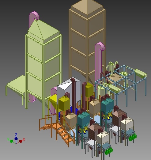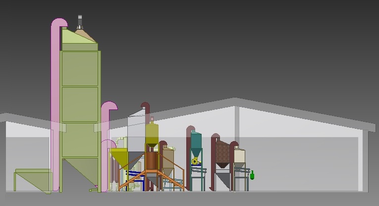 - В подготовительном отделении зерно принимают, на зерноочистительном станке очищают от сорных примесей, таких как семечки, овес и т.д., на камнеотделительном станке отделяют от различных минеральных примесей. В барабанной электрической сушилке производится предварительная просушка. Кроме этого, в подготовительном отделении смонтирован вентилятор пневмотранспорта зерна, система приточной вентиляции с возможностью подогрева воздуха. Схема, по которой смонтировано оборудование, позволяет направлять зерно в шелушильное отделение, минуя предварительную сушку, если влажность соответствует требованиям технологического процесса (не более 14,5%).