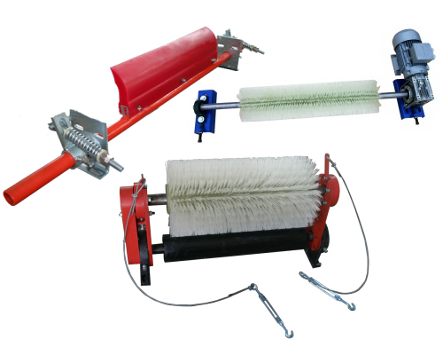 - Поз.3 – Щетка электрическая для очистки конвейерной ленты. Щетки подходят для очистки как гладкой, так и шевронной конвейерной ленты, а также ленты с перегородками. Чистящая щетка устанавливается непосредственно за приводным барабаном или в середине обратной ветви конвейера. Благодаря нейлоновой щетине, вращающейся в обратном направлении по отношению к движению ленты, достигается тщательная и бережная очистка конвейерной ленты.
